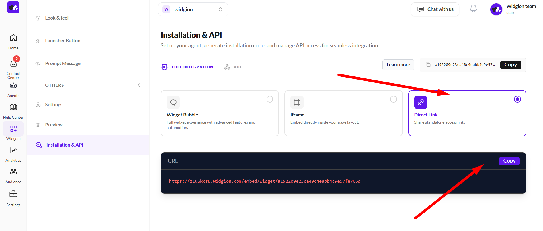 The Direct Link method provides a standalone URL to your widget, allowing you to share access without embedding it into your website. This is useful for sharing content through menus, buttons, emails, or support messages.