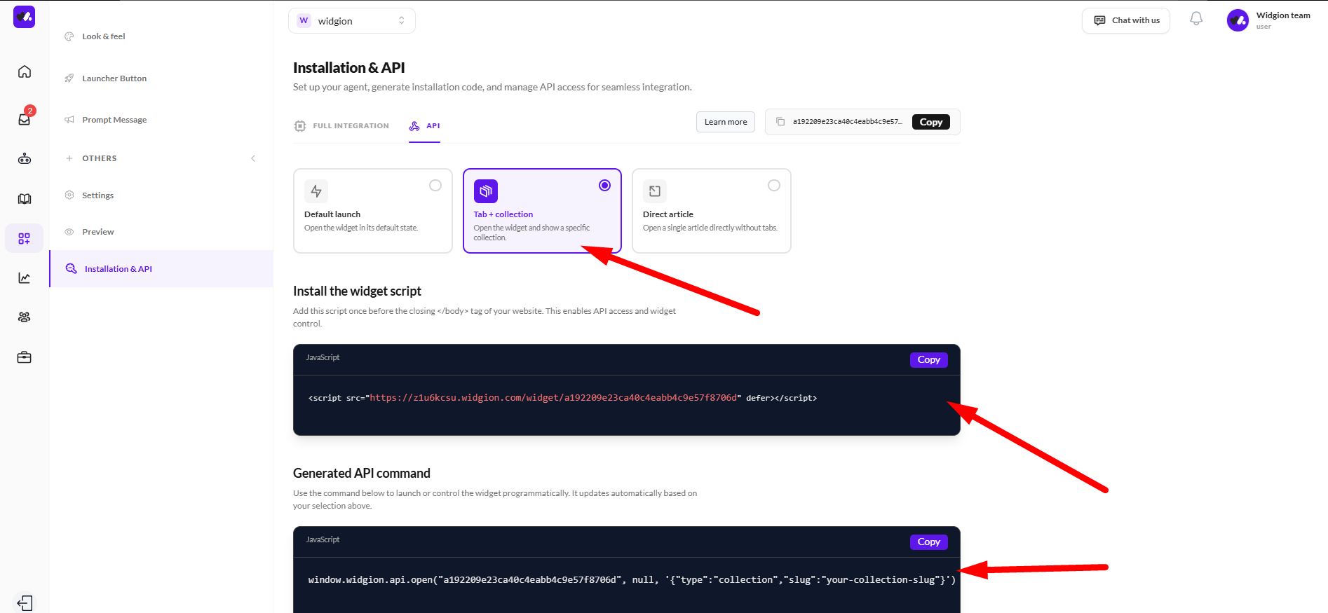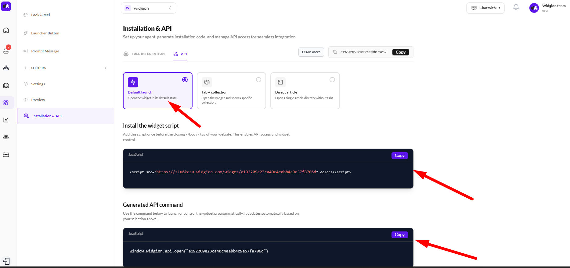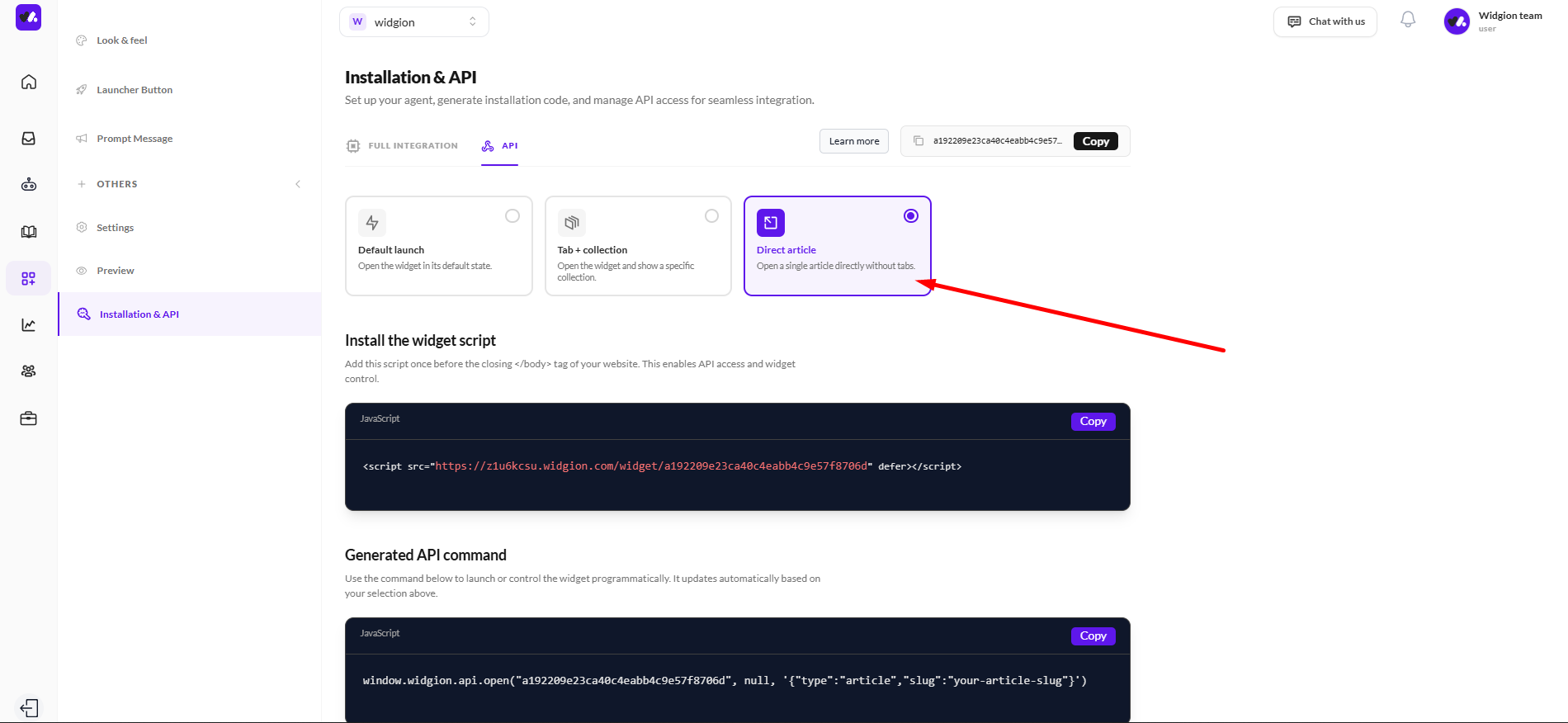 To set this up, install the base widget script and then add the generated API command to your code. When triggered, the widget opens directly to the selected content, creating a fast and targeted user experience.