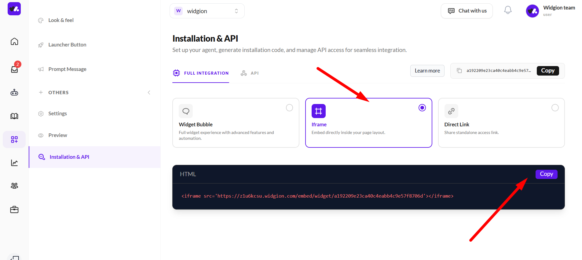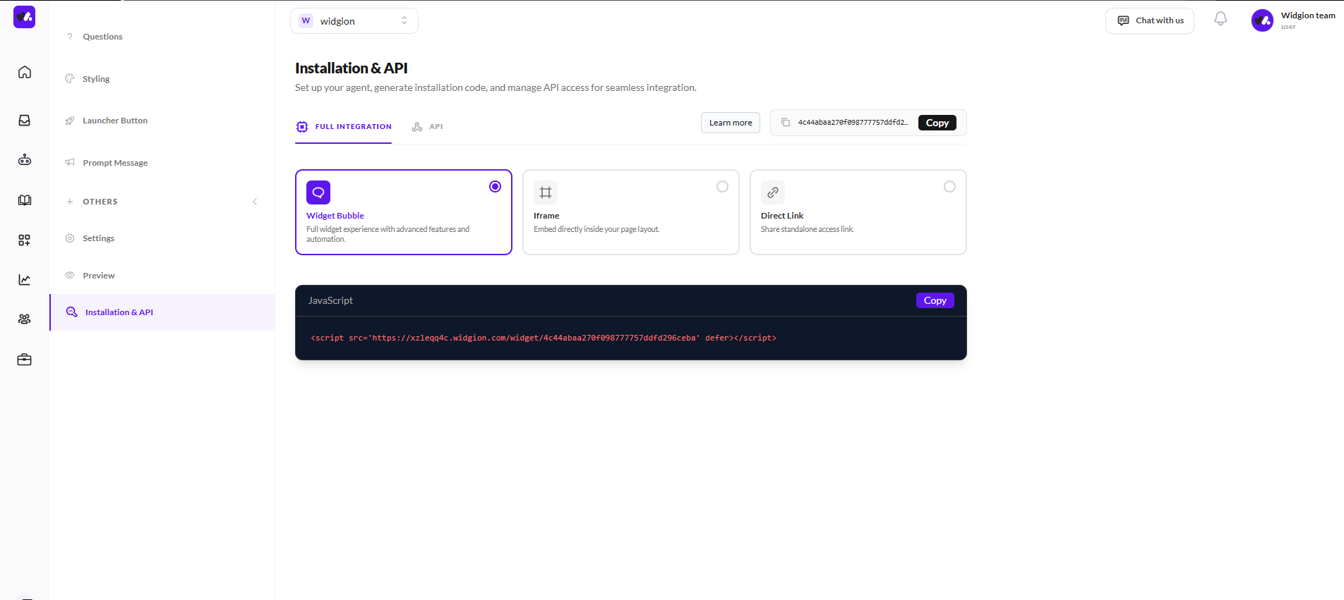 Each installation method serves a different purpose depending on how you want users to interact with your widget. The Widget Bubble is ideal for always-accessible support, the Iframe works well for embedded layouts, and the Direct Link is best for quick sharing.