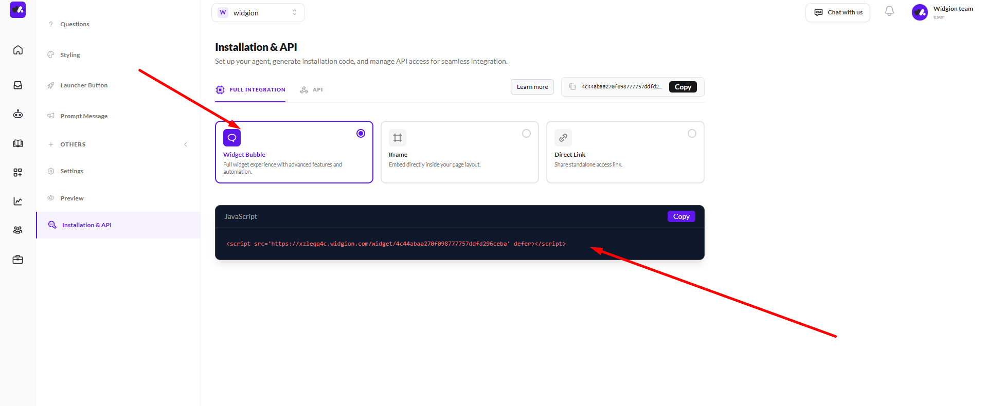 To install it, select the Widget Bubble option and copy the generated JavaScript code. Paste this code into your websiteβs HTML, typically just before the closing </body> tag. Once added, the widget will appear on your site and automatically sync with your selected content source.
