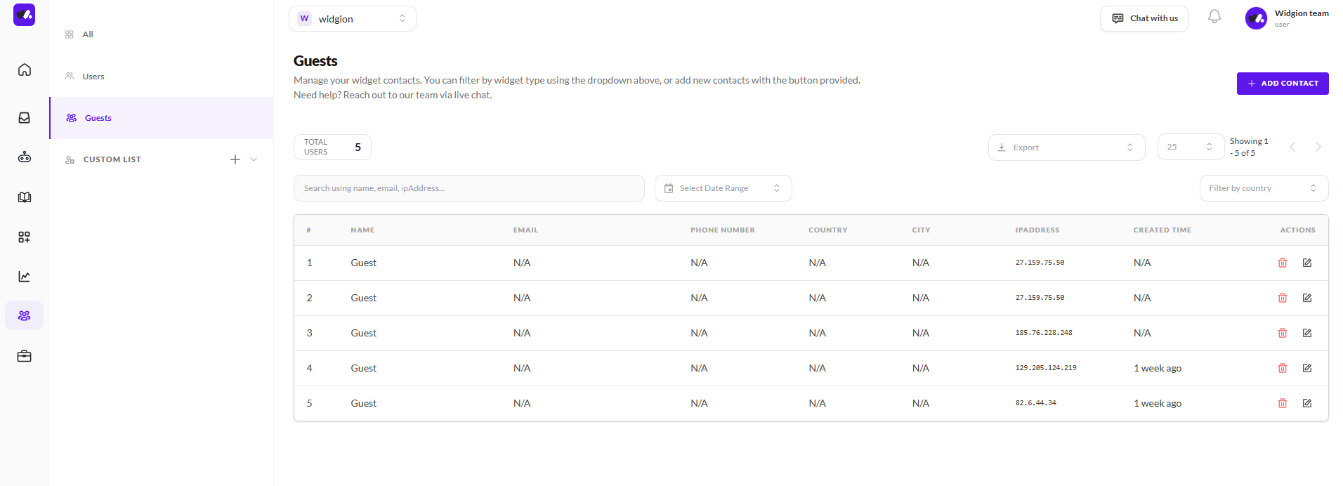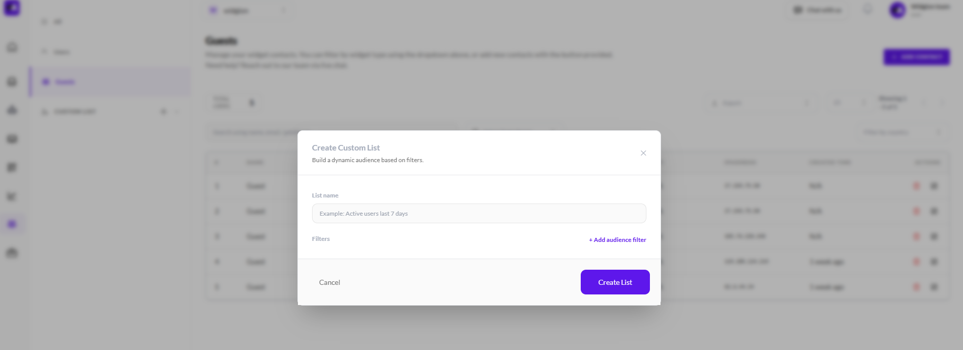 Widgion organizes the people who interact with your widget into three distinct contact types — Users, Guests, and Custom Lists. Each one represents a different kind of visitor, and understanding the difference helps you manage your audience more effectively. All three are accessible from the Audience section in the left sidebar.