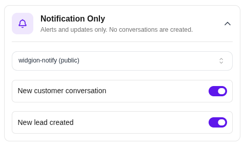 You can also choose which events to receive notifications for, such as new customer conversations or newly created leads. When enabled, Widgion will automatically send updates to the selected channel, helping your team stay aware of activity in real time.