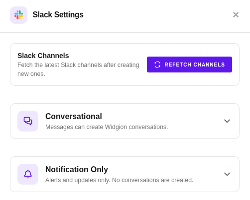 After connecting your Slack workspace, you can configure how channels are used inside Widgion from the Slack Settings panel. Widgion supports two channel roles, each serving a different purpose.