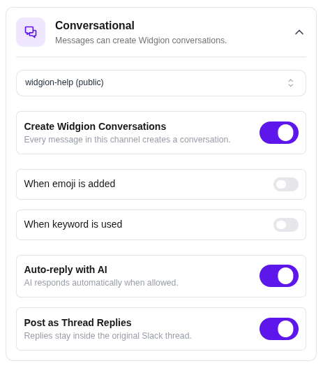 Channels assigned as Conversational are used for active interactions between Slack and Widgion. You can select the channel you want to use and control how messages are handled. When Create Widgion Conversations is enabled, messages in the selected channel will automatically create conversations. You can further refine this by using triggers, such as creating conversations only when an emoji is added or when specific keywords are used.