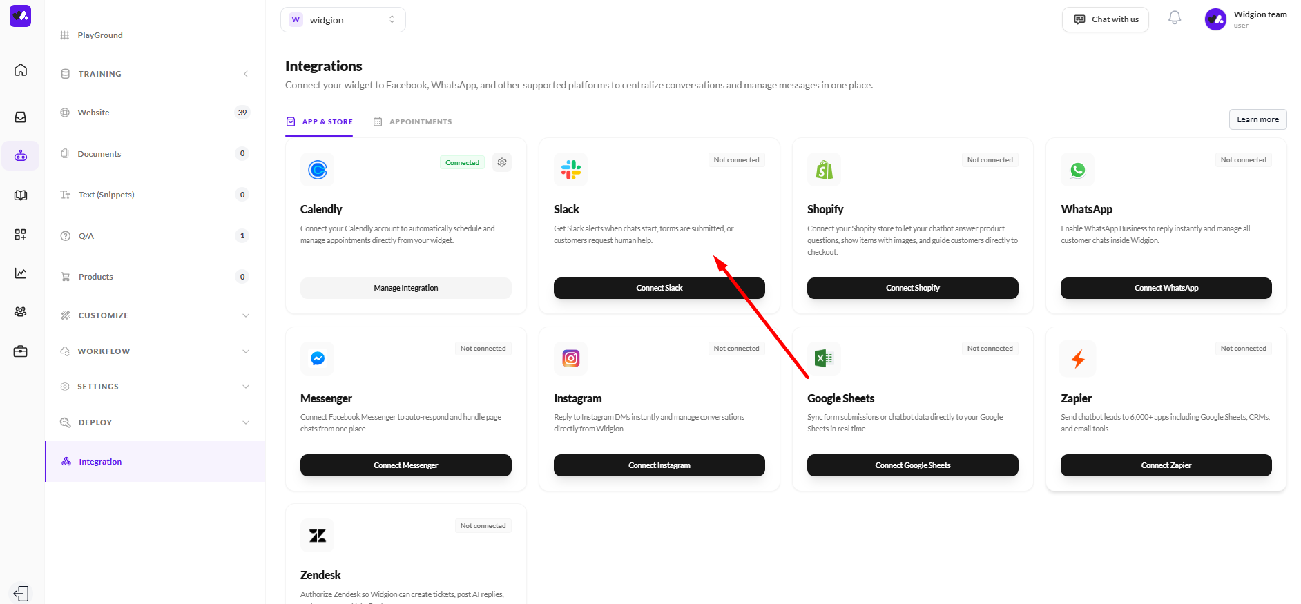 Log in to your Widgion account and open your project. Navigate to the Integrations section, then select Slack and proceed to connect it to your chatbot.