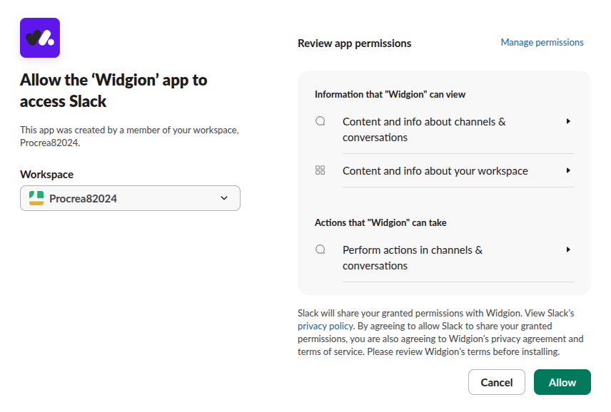 Next, review the requested permissions, which allow Widgion to access channel and conversation information, view basic workspace details, and send messages or replies in channels. Once you’ve reviewed everything, click Allow to complete the connection, and you’ll be redirected back to Widgion.